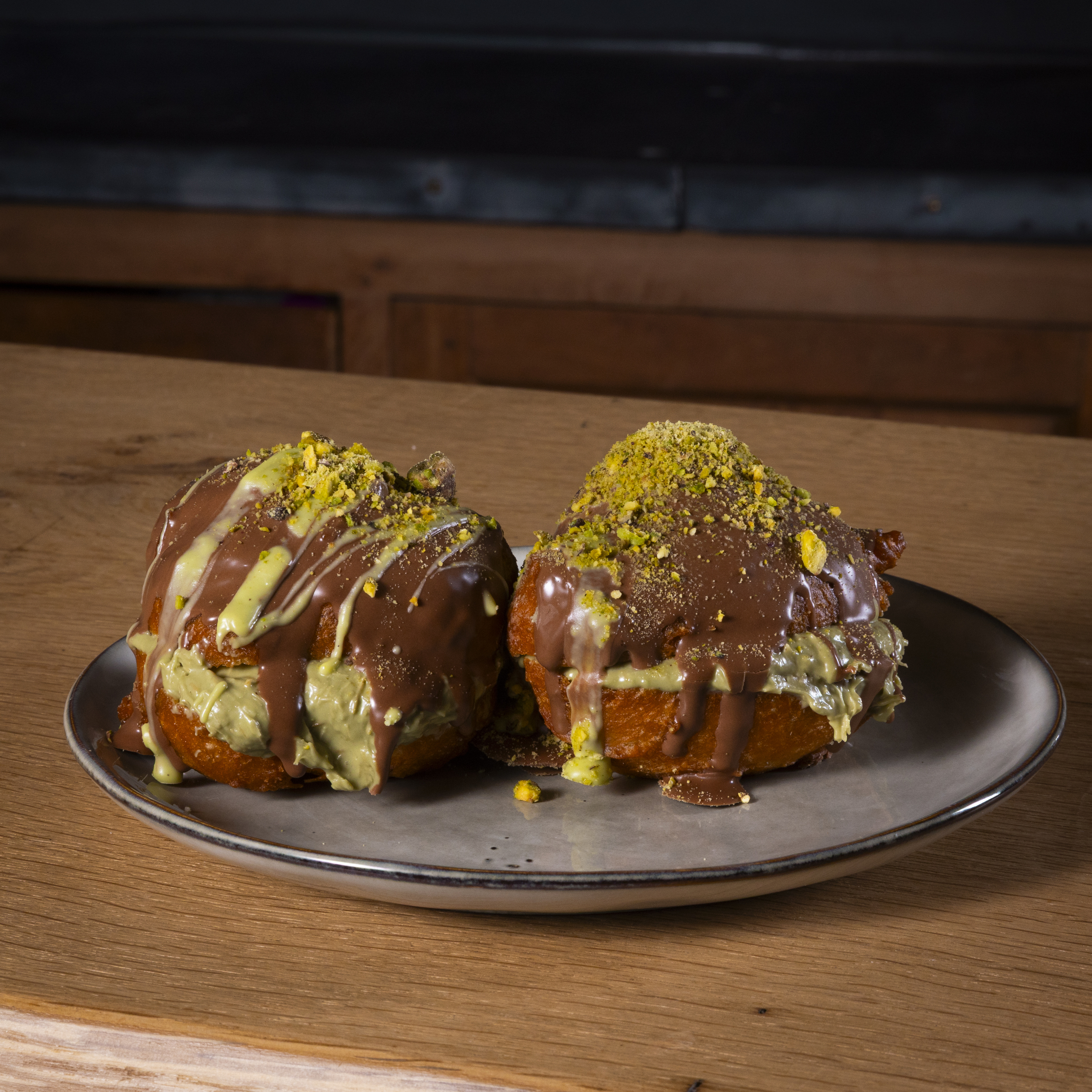 Heerlijk gevuld met pistache pasta en ………. met melk en witte chocolade en pistache crunch afgetopt.